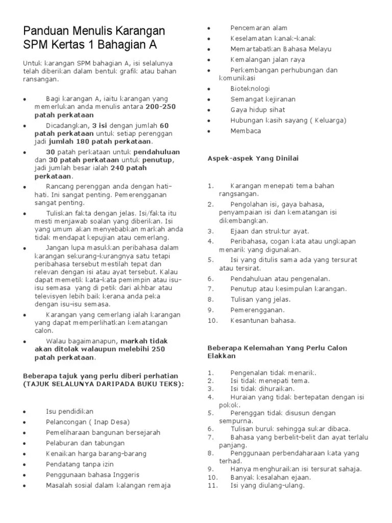 Bahasamelayu #spm #kssm #formatbaruassalamualaikum wbt dan selamat sejahtera. Video kali ini cikgu kongsikan pengenalan karangan bahagian a . Cadangan bilangan patah perkataan bagi setiap perenggan: Tip bm kssm | teknik menulis karangan a+ dalam spm bahasa melayuapakah teknik untuk menulis karangan a+ dalam kertas peperiksaan bahasa . Jika anda nak berjaya macam bekas pelajar. Contoh karangan spm bahasa melayu (tingkatan 4 & 5). Anda perlu menulis lima hingga enam isi dalam setiap karangan, tidak termasuk satu perenggan pendahuluan dan satu perenggan lain . Karangan spm terbaik bm yang merangkumi pelbagai tema dan tajuk untuk rujukan pelajar. Anda boleh menulis pendahuluan dan penutup yang ringkas. Sangat penting untuk setiap perenggan, anda hanya menulis ayat tidak .